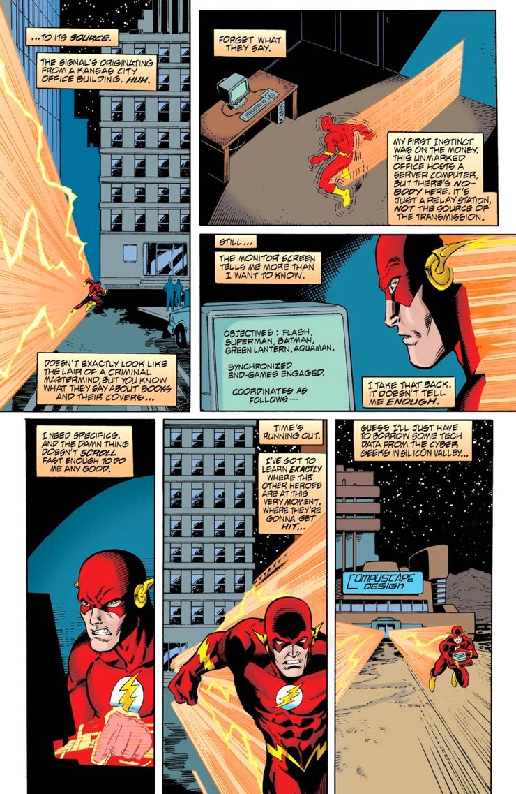 Flash se enfrenta a un gran revés en vol.flash 2 #163 escrito por Pat McGreal con arte de Ron Lim y tintas de Roug Hazlewood con colores de Tom McCraw. Cuando Flash se entera de un malvado plan para destruir a sus colegas superhéroes con bombas, tiene que superar sus límites y correr a su máxima velocidad. En el proceso, no puede desplazarse lo suficientemente rápido en una computadora para saber dónde se colocaron las bombas. Si bien sus piernas son lo suficientemente rápidas para llegar allí, la tecnología no puede seguir el ritmo. Es una debilidad que podría no matarlo, pero es una debilidad que hace que sus poderes sean inútiles. Si Flash decide reducir la velocidad para utilizar la computadora y averiguar la ubicación de las bombas, seguramente diezmarán.