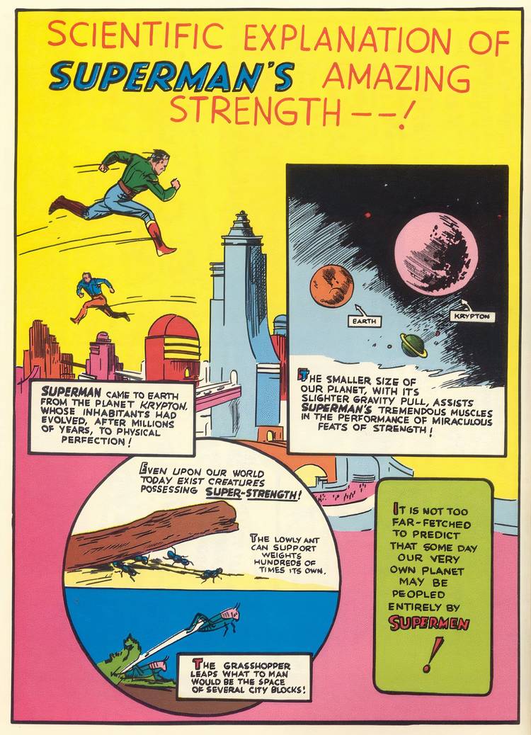 En 1939 Superhombre #1 de Jerry Siegel y Joe Shuster, el legendario dúo creativo intentó explicar exactamente cómo Superman obtuvo sus inmensos poderes. La explicación que se les ocurrió no es tan divertida como ser impulsado por el sol, pero era lo suficientemente buena para 1939. En lugar de ser impulsado por el sol amarillo, Superman en realidad estaba aprovechando la gravedad más débil de la Tierra en comparación con Krypton.