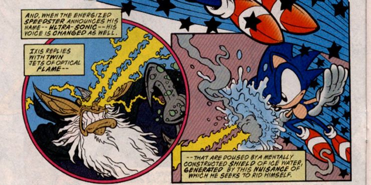 En Sonic el erizo #66 por Karl Bollers y Steven Butler, Blue Blur absorbe una cantidad incalculable de Power Rings que lo transformarían en Super Sonic si no hubiera tantos. Estos anillos adicionales le permiten trascender a una forma a la que él se refiere como Ultra Sonic, un estado donde la energía azul y las estrellas negras siguen cada uno de sus movimientos. Ultra Sonic también realiza algunas hazañas increíbles en este momento mientras lucha contra el malvado mago Ixis Naugus, quien desafortunadamente también absorbe suficientes anillos para transformarse. Cuando Ixis dispara chorros gemelos de llamas ópticas, Ultra Sonic responde invocando un escudo de agua helada que apaga el ataque de fuego. Luego, Ultra Sonic bloquea el líquido hirviendo levantando las manos sobre su cabeza, un movimiento que hace que una pared de granito se levante del suelo frente a él.