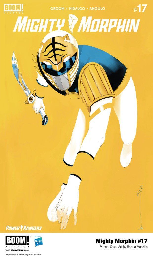 La portada variante de Helena Masellis retrata al White Ranger con su espada encantada, Saba. Se desliza como un gato, o un tigre, sobre un fondo que combina a la perfección el oro de su cinturón y otros adornos. La portada variante de Goñi Montes, artista de títulos como Negro radiante y el Mighty Morphin Power Rangers: Rangers y Zords libro de afiches, utiliza magníficamente la luz, la sombra y el espacio para crear electricidad a través y alrededor de Rita Repulsa. En las páginas de vista previa, las piezas del tubo de Zordon se encuentran esparcidas por los restos del cuartel general de los Power Rangers. Aunque, Zordon anuncia que todavía existe la esperanza, incluso después de perder la fe en un miembro del equipo, para reconstruir si los Rangers pueden ubicar otros puestos avanzados de Eltarian.