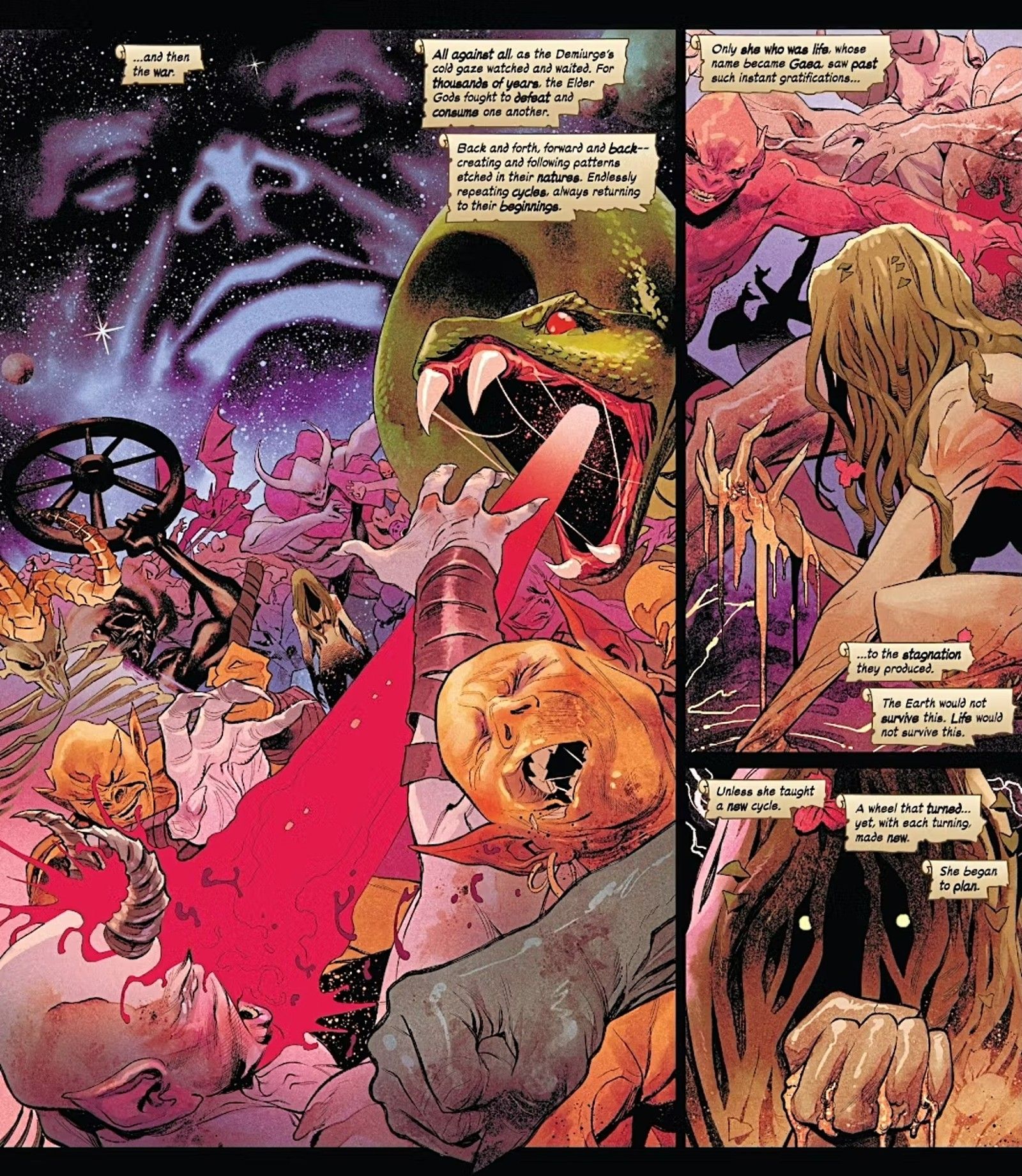 Los Dioses Mayores son los primeros seres vivos y dioses de la Tierra. Thor inmortal # 5 establece firmemente a Gaea como el primer héroe de Marvel, un título ganado por su papel en detener los ataques de los Dioses Mayores. En el número, los lectores ven un flashback de la creación de los Dioses Mayores por parte del Demiurgo, enfatizando sus guerras como conflictos cíclicos. Como señala el narrador de la serie aún no revelado, Gea es el único Dios anciano que ve este patrón. En lugar de destruir a todos los Dioses Antiguos, varios de los seres Utgard recientemente introducidos finalmente están siendo desterrados, incluido Thor inmortal antagonista y Dios original del Trueno Toranos.