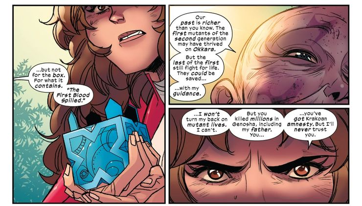 El problema con esto es que Cassandra Nova tiene una larga y violenta historia con los Shi’ar, habiendo tomado posesión de la entonces Majestrix Lilandra en las páginas de Grant Morrison y Frank Quitely’s. Nuevos X-Men, casi matando a los mutantes en la Tierra y destruyendo efectivamente todo el Imperio Shi’ar durante algún tiempo. En Merodeadores # 1 – escrito por Steve Orlando con arte de Eleonora Carlini y Matt Milla y letras de Ariana Maher – Pryde confronta a Cassandra Nova por una caja de 2 mil millones de años que encontró en las páginas de Merodeadores Anual #1. Aparentemente, la caja antigua, escrita con la propia letra de Pryde, la llevó al área de Krakoa donde Nova había sido aislada, lo que llevó a Cassandra a revelarle a la capitana Kate que la caja en sí no es importante, pero sí lo que contiene. Nova le dice a Kate que la caja está conectada a un evento antiguo llamado “La primera sangre derramada”.