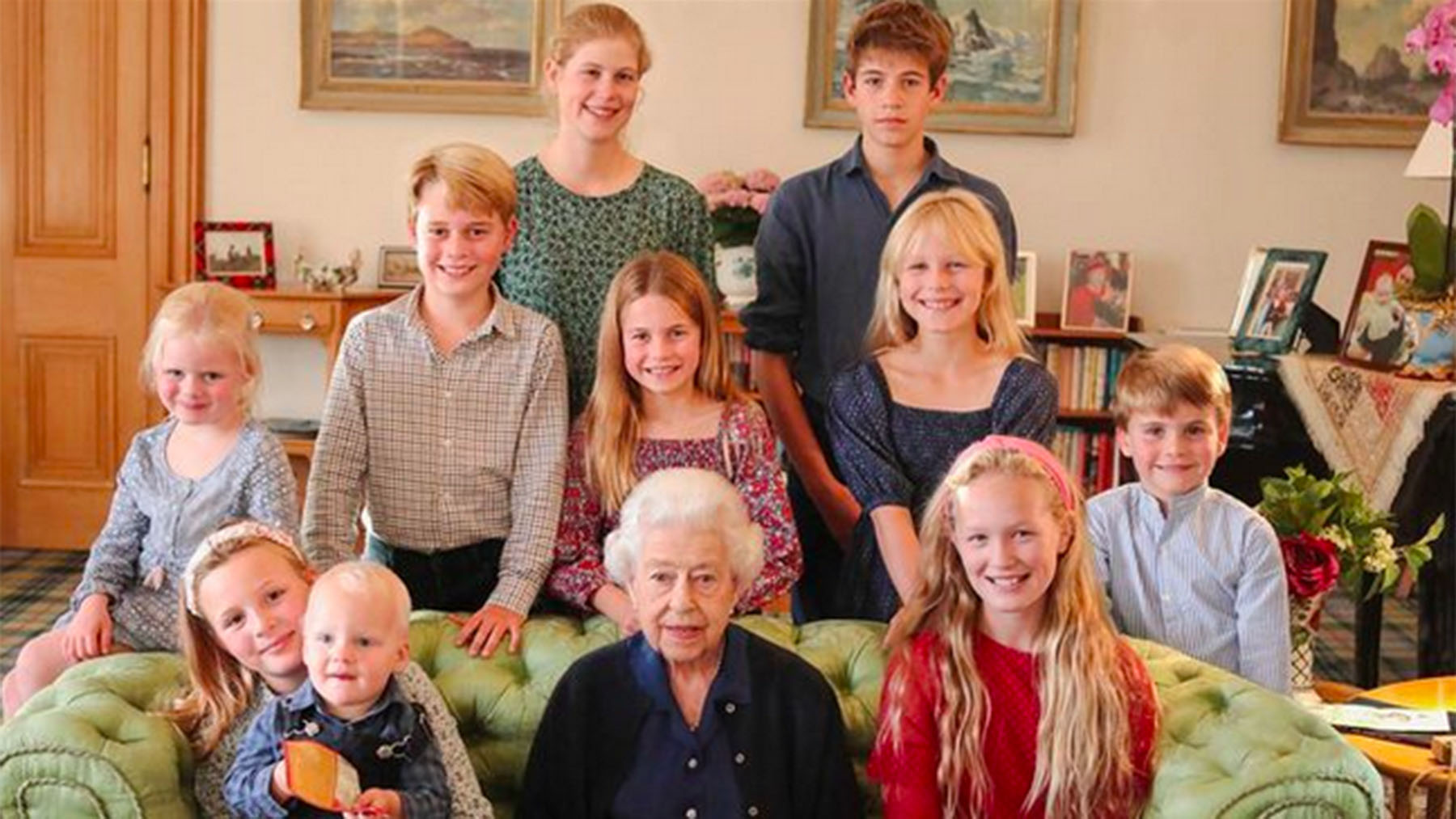 En el centro de la fotografía aparece una orgullosa reina isabel, sentada en un sofá chéster vestida con la tradicional falda con un estampado de cuadros escoceses, camisa azul y chaqueta de punto. A su lado, Mia Tindall sosteniendo a su hermano Lucas, hijos de Zara Tindall, y al otro lado, Savannah Phillips, hija de Peter Phillips. Justo detrás, Lena Tindall, los príncipes George, Charlotte, Isla Phillips y el príncipe Louis y en la última fila Lady Louise Windsor y James.