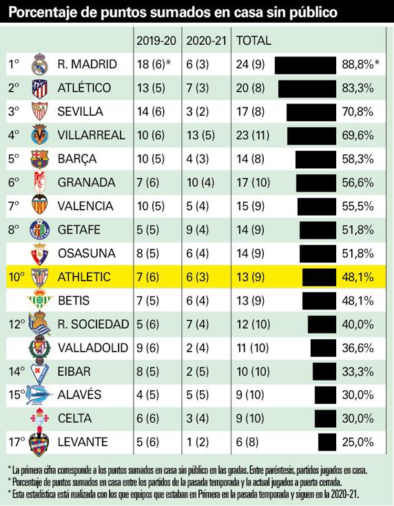 El Athletic es el décimo equipo de Primera en porcentaje de puntos sumados en casa sin público en las gradas, empatado con el Betis. Los bilbaínos han sumado el 48,1% como local desde que el fin de semana del 13 y 14 de junio se recuperó la competición tras el parón obligado por la crisis sanitaria que sigue teniendo en un vilo a toda la población. En este periodo, el equipo de Garitano ha disputado un total de nueve encuentros como local en los que ha logrado 13 de los 27 puntos puestos en juego.