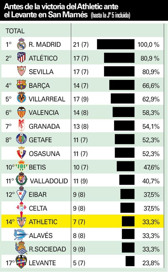 Los datos son claros. Antes de ganar a los granotas, el Athletic era penúltimo en este ranking entre los 17 equipos que eran de Primera la pasada campaña y siguen en la máxima categoría en la actual. Solamente pudo sumar siete puntos en otros tantos encuentros (33,3%), curiosamente al igual que Alavés y Real Sociedad, y solamente por encima del Levante (23,8%).
