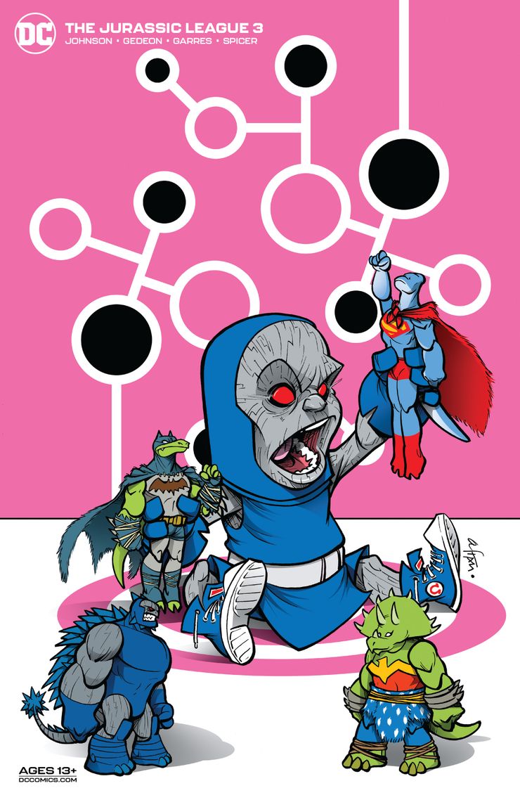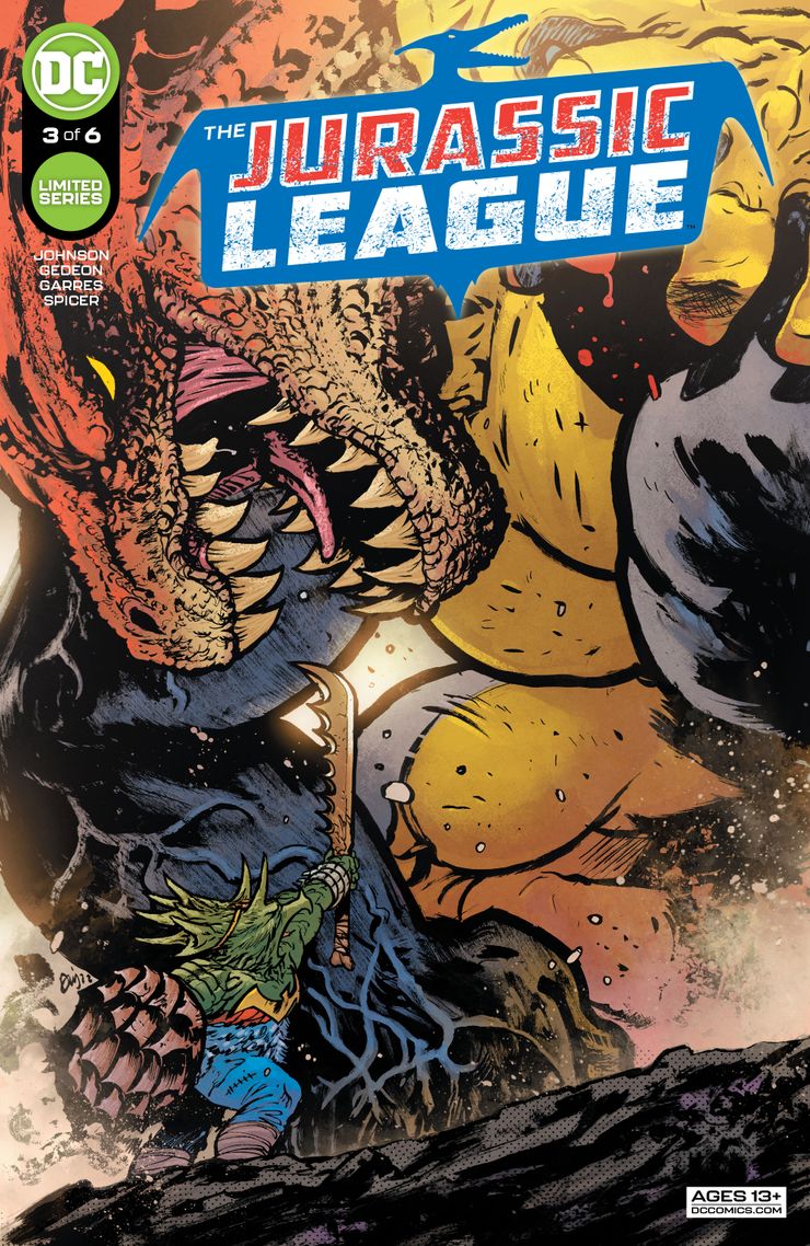JURASSIC LEAGUE #3- Con Wonderdon entrando en la refriega para ayudar a Batsaur y Supersaur a derrotar a Brontozarro, ¡la Jurassic League se ha formado oficialmente! Pero las misteriosas maquinaciones de Darkseid continúan revelándose, y esta trinidad triásica podría no ser suficiente para detenerlo. Por suerte, un heroico hadrosaurio se ha unido a la batalla. ¡Entra la Antorcha Verde!