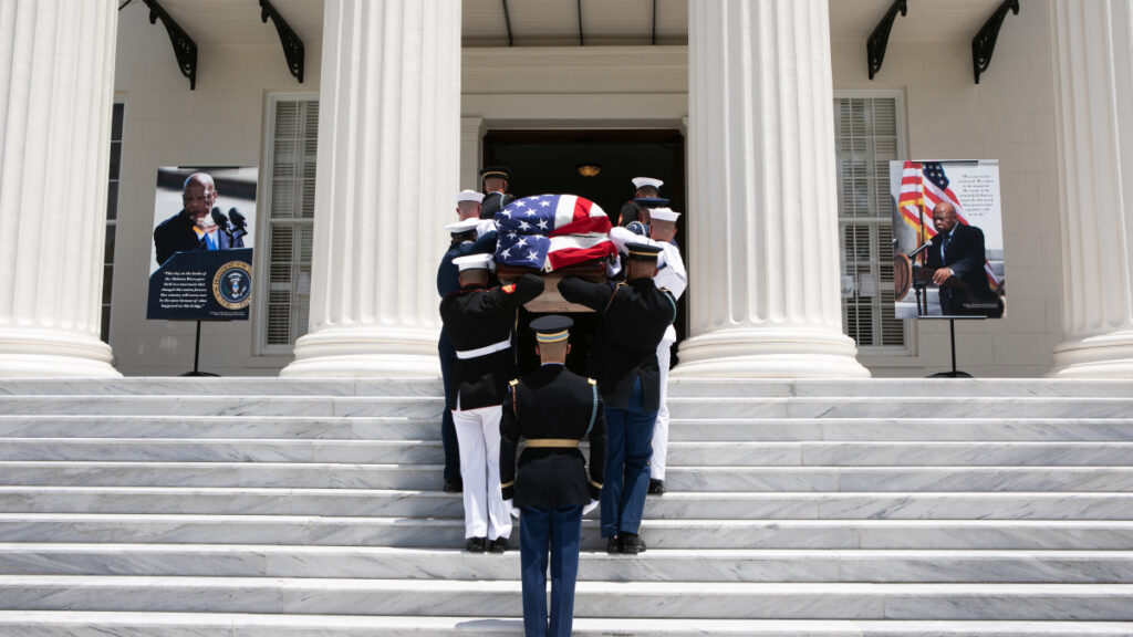 Mientras una guardia de honor militar retiraba el ataúd de Lewis de la carroza, algunos agentes estatales, incluidos afroestadounidenses, hicieron un saludo a Lewis.