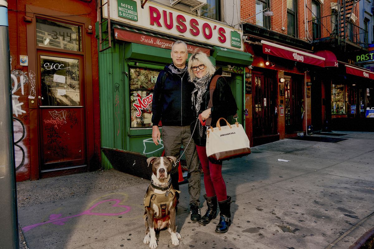 Gracias a este trabalenguas de ser el escaparate desde el que descubrir los escaparates con más encanto de la ciudad, Karla y James son ahora, junto con su inseparable perro Hudson, verdaderas instituciones en Manhattan. Sobre todo en el East Village, el barrio donde se concentra la mayor parte de sus “musas” y en el que nos citaron para la entrevista. Se decidieron por la calle 11 en la esquina con la Primera Avenida por el combo que forman la minúscula tienda de alimentación italiana Russo’s, abierta en 1908 y con una vitrina a rebosar de quesos y jamones de Parma, y el restaurante-pastelería Veniero’s, que tiene unos globos dorados celebrando su 127º aniversario que casi tapan los panetones, cannolis y tartas de queso italianas que albergan en su interior. Cuenta Karla que en Russo’s hacen la mozzarella en el sótano y que es ya la cuarta generación de la misma familia siciliana la que lo regenta. En Veniero’s recuerda que, gracias a este negocio, la electricidad llegó a esta zona del East Village, pues fue el dueño quien recogió firmas entre sus decenas de clientes habituales para conseguirlo. Ya en el presente, uno de los empleados interrumpe la entrevista para agradecer a Karla y a James que, en el momento más duro de la pandemia, una foto de su establecimiento en el Instagram de la pareja reactivó las ventas de manera milagrosa.