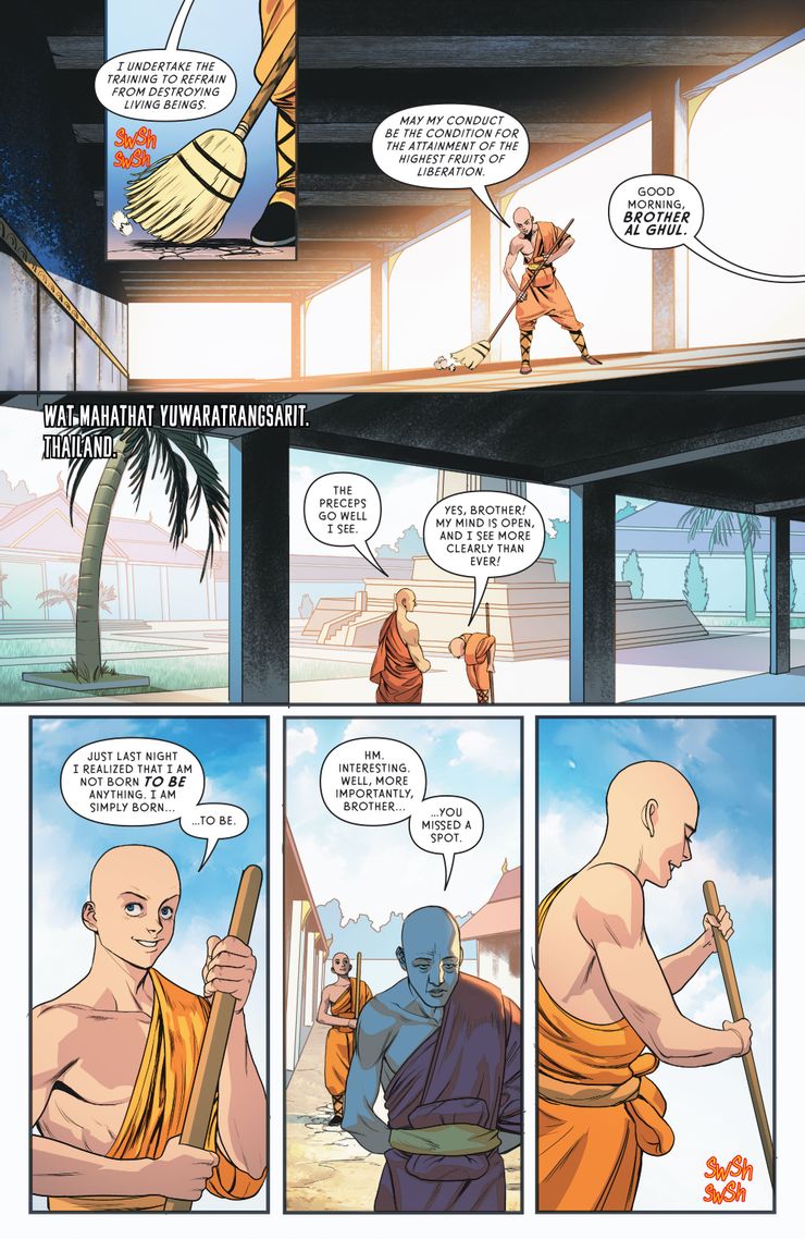 El avance comienza en Tailandia, donde Damian Wayne, ataviado como un monje, está barriendo el suelo del monasterio donde vive, cantando mantras todo el tiempo. Los lectores aprenden que Damian, aquí llamado “Hermano Al Ghul”, está viviendo una vida simple pero plena. A continuación, se ve a Spoiler ayudando hábilmente a sus compañeros de equipo en los Teen Titans. Los lectores conocen a Jason Todd, en este mundo es un campeón de carreras de autos que dedica sus ganancias a ayudar a financiar centros de tratamiento de drogas como una forma de honrar la memoria de su madre. Finalmente, Dick Grayson aparentemente ha regresado a su vida como agente secreto, trabajando con Helena Bertenelli en un caso en Markovia, donde recoge un misterioso maletín de Zealot of WildCATS.