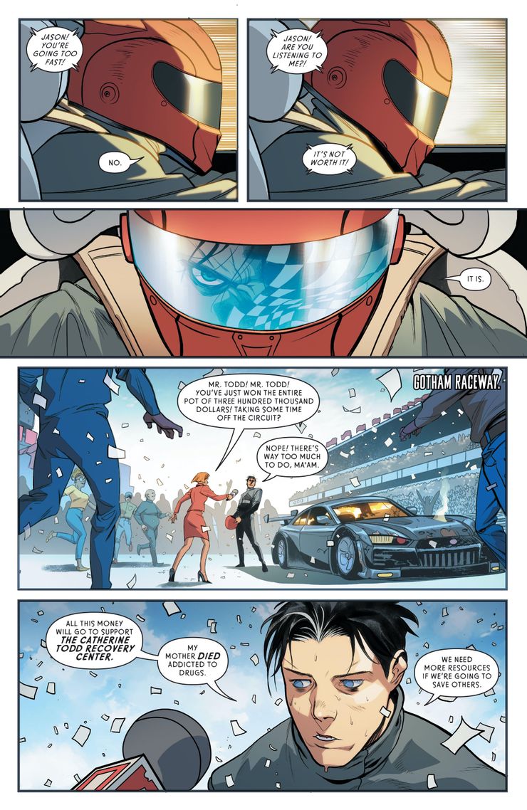 CC petirrojos están viviendo vidas alternas, libres de de batman influencia. en un adelanto de Petirrojos #5, cuatro Robins, pasados y presentes, están viviendo sus mejores vidas como pilotos de carreras y miembros de los Teen Titans. Y mientras disfrutan de sus vidas plenas, está claro que algo anda mal, a saber, la falta de la presencia de Batman. El número está a la venta en las tiendas el 15 de marzo.