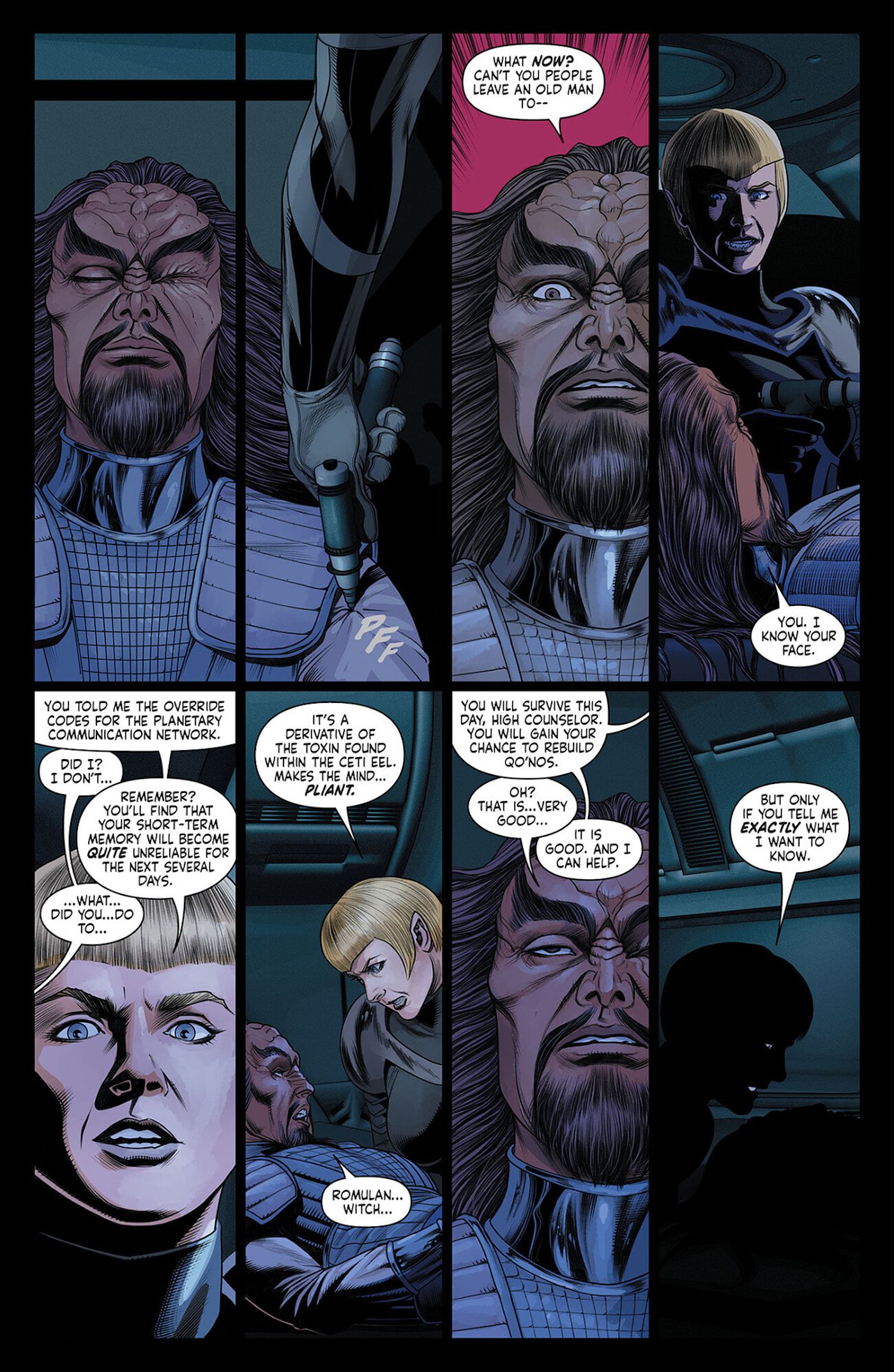 Las anguilas Ceti son algunas de las criaturas más inquietantes jamás vistas en Star Trek – y ahora los romulanos planean utilizar estas criaturas como parte de un plan para debilitar de alguna manera al Imperio Klingon. Sela le administra la toxina a Korath, que ocupa una alta posición en la sociedad klingon. Sela “promete” ayudar a Korath a reconstruir el mundo natal de los klingon, pero él tiene que darle información. Se desconoce qué es capaz de sacarle, pero más adelante en el número, un texto enumera un mensaje subespacial que Sela envió a sus superiores. Aunque está muy redactado, menciona a Martok, el canciller klingon, así como plataformas de defensa orbitales y suborbitales.