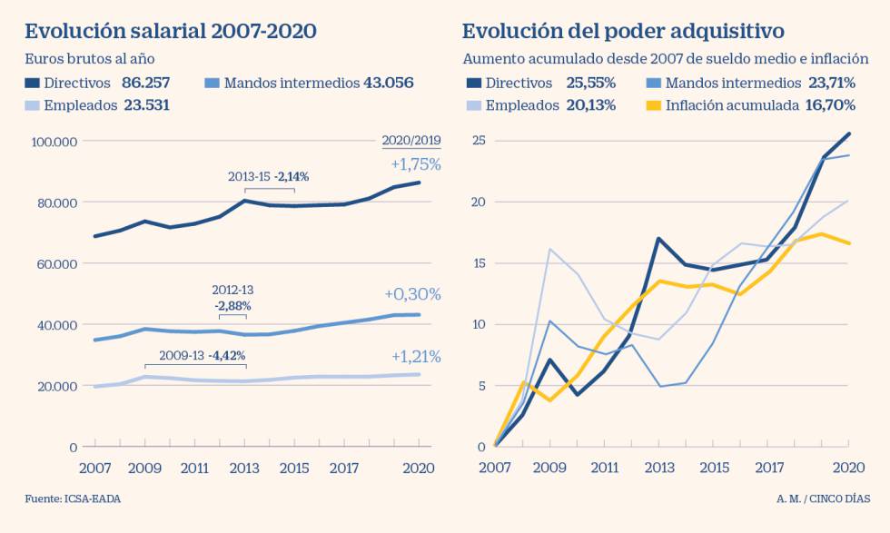 Pero junto a estos datos oficiales del registro de convenios surgen otros datos derivados de estudios académicos que también apuntan a una evolución moderada pero positiva de las retribuciones. Es el caso del estudio que realiza desde hace más de una década la consultora ICSA Grupo en colaboración con la escuela de negocios Eada Business School de Barcelona. El informe realizado por estas entidades, con más de 80.000 datos salariales recopilados entre los meses de julio de 2019 y 2020, analiza la evolución de tres grandes categorías laborales: directivos, mandos intermedios y empleados. Una de sus principales conclusiones es que las retribuciones de los mandos intermedios (43.056 euros brutos anuales de media) quedaron prácticamente estancadas el pasado año, con un avance del 0,3% respecto a 2019 y, por tanto, fueron las más afectadas por la pandemia, mientras que los directivos experimentaron un incremento salarial medio del 1,75% (hasta los 86.257 euros brutos anuales) y los empleados, del 1,21% (23.531 euros brutos al año).
