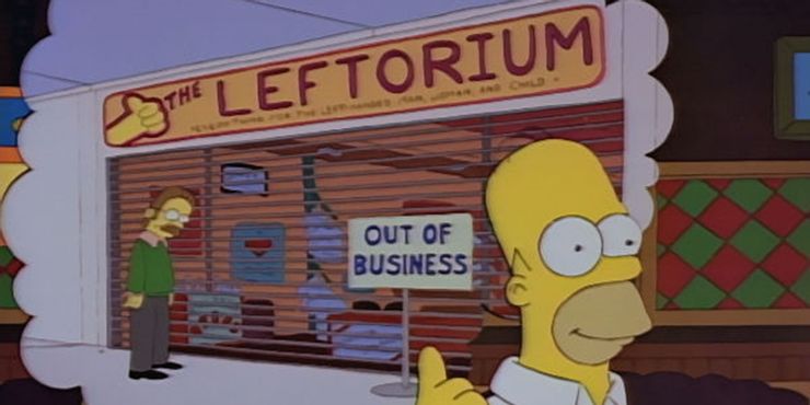 Flanders abre una tienda para zurdos llamada The Leftorium en “When Flanders Failed” de la temporada 3, y Homer usa una espoleta para condenar la nueva empresa comercial de su vecino.