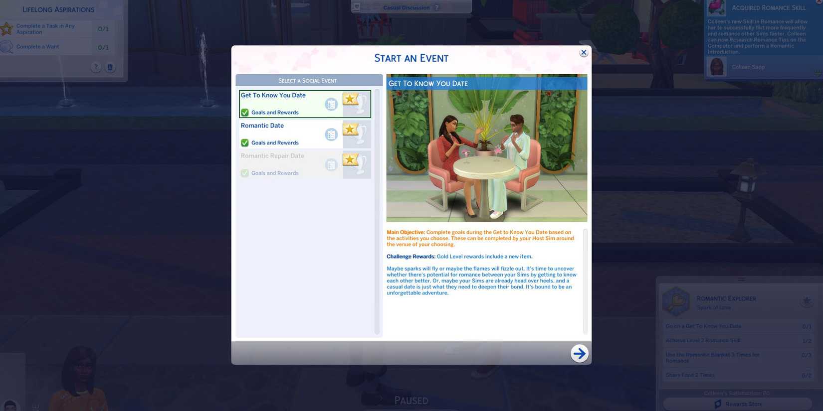 Invita a otro Sim a una cita y selecciona el objetivo del evento “Conocerte en una cita”.