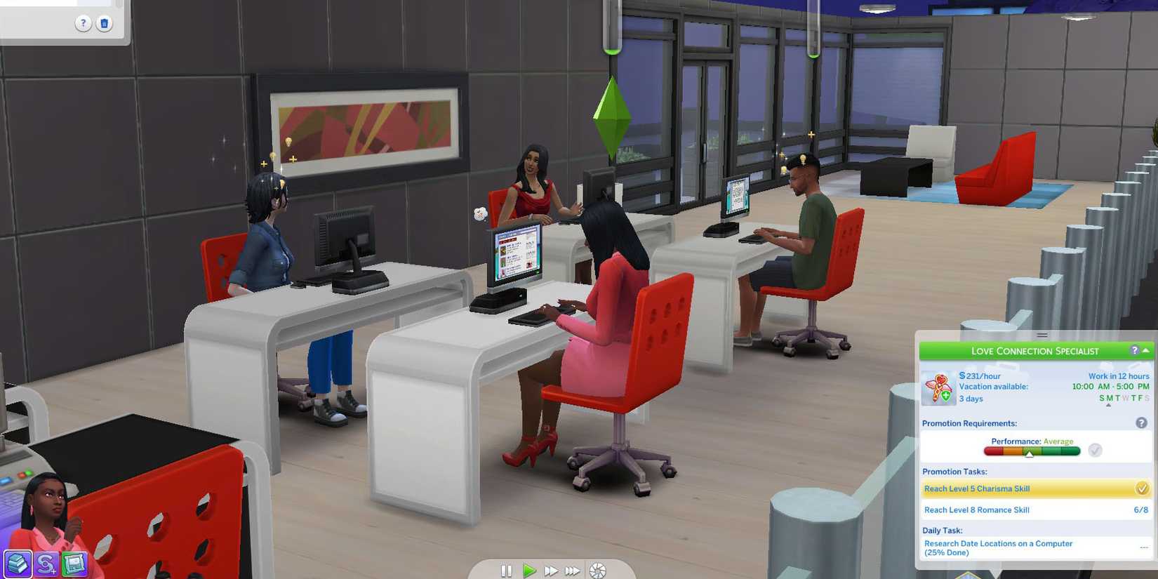 La youtuber Elliandra probó esta nueva profesión. La mayor parte del trabajo implica usar la computadora para investigar temas y conversar con los clientes. Para ascender en la carrera, el Sim necesitará un buen nivel de habilidad romántica, ya sea leyendo libros o experimentando el amor en primera persona.