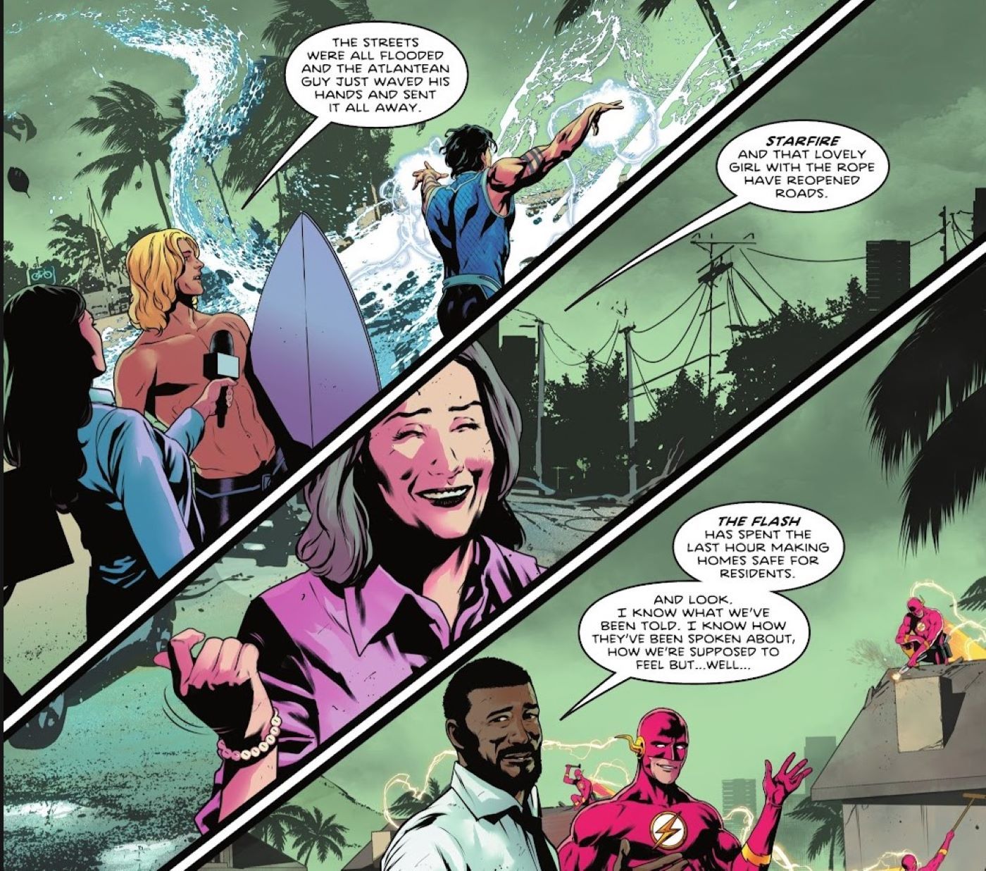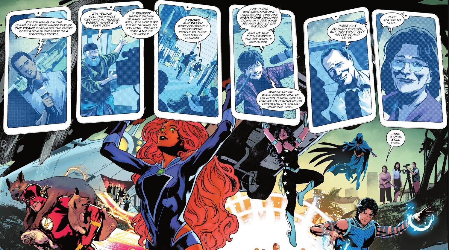 Titanes El número 9 de Tom Taylor y Lucas Meyer comienza con los Titanes ayudando después de un huracán de categoría cuatro, una crisis a la que respondieron en el número anterior. La misión es considerada un éxito tanto por el equipo como por los civiles, que son entrevistados. expresando gratitud por la continua ayuda de los Titanes incluso después de que haya pasado el principal peligro de la tormenta.