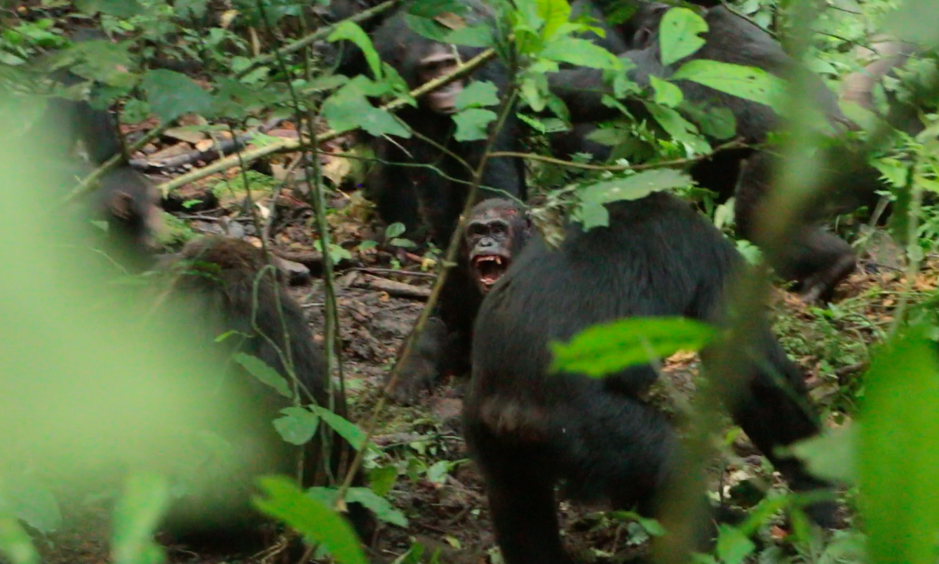 Aquella tarde, algo llamó la atención de los científicos mientras un numeroso grupo del clan central comía tranquilamente en las ramas de los frutales. Todos los chimpancés se quedaron helados mirando hacia el suelo. Abajo, un grupo de los occidentales —que incluía hembras con bebés—, se acercó con signos de hostilidad. Tras unos gritos y gestos amenazadores, algunos chimpancés del bando occidental comenzaron a ascender por el follaje, acosando al otro grupo, que se dispersó asustado. La hembra Carson, con su cría aferrada al vientre, persiguió a la hembra Christine, que también cargaba a su bebé, y se golpearon. Los machos occidentales empezaron a sitiar a distintos rivales en medio de un caos creciente hasta que Basie, un macho de 33 años y alto rango en la jerarquía de Ngogo, cayó o saltó desde las ramas a 15 metros de altura, acorralado por los atacantes.