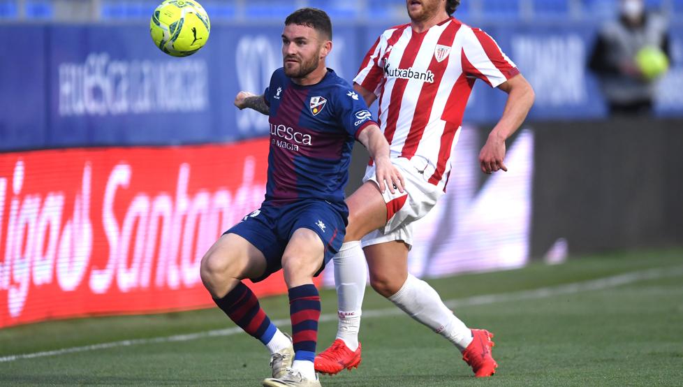 Galán, al que le mostraron una amarilla que al ser la quinta del curso le supondrá un partido de sanción, el que disputará el Huesca contra el Valencia en su propio campo.