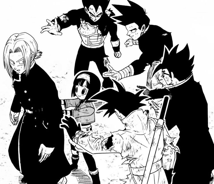 Con la espalda contra la pared, Trunks recibe energía de los otros miembros de la Patrulla del Tiempo, realizando accidentalmente el ritual del Dios Super Saiyajin.
