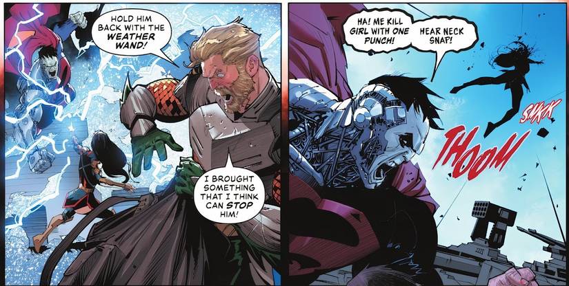 Después de escapar por poco de la Fortaleza de la Soledad, los héroes se enfrentan a la cruda realidad de su situación: ¿cómo pueden luchar contra Waller sin sus poderes? Nightwing interviene, lo que incita a Hal a revelar que Ahora poseen la gama completa de armas rebeldes que anteriormente estaban guardadas en el almacén de la Liga de la Justicia.Enumera elementos formidables como una pistola de frío, una varita meteorológica y un hacha de rayos, mostrando la variedad de herramientas que ahora tienen a su disposición. Esta infusión de armas poderosas es un avance crítico y bienvenido, que brinda a los héroes una ventaja muy necesaria en su lucha en curso contra Waller.