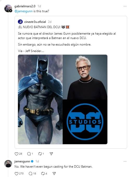 - Gunn afirma en Threads que el casting para Batman de DCU ni siquiera ha comenzado, aclarando la confusión.