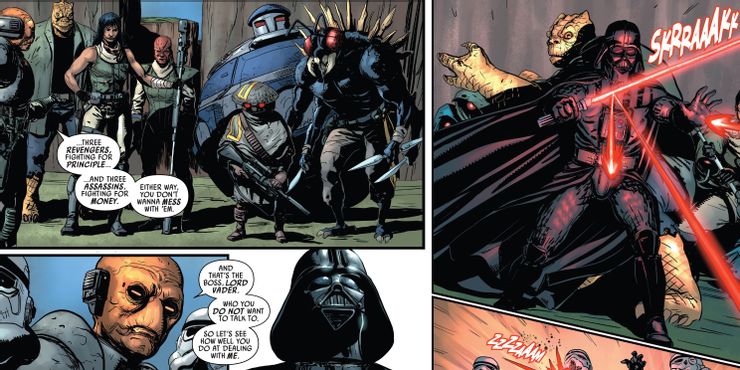 Reclutando a estos Revengers junto a Ochi y los asesinos que ya había contratado, Vader ahora tiene un gran equipo a su disposición en el nuevo Darth Vader # 19 de Pak y del artista Guiun Vilanova. Sin embargo, los Vengadores se utilizan como cebo para suavizar las defensas de Crimson Dawn antes de que él y los asesinos entren. Como tal, los Vengadores de Vader tienen un propósito y un papel mucho más oscuro en comparación con el equipo de Vengadores de Thor, un nombre que simplemente salió de Thor. y Valkyrie queriendo vengarse de Hela (aunque es un riff humorístico del nombre de los Vengadores).