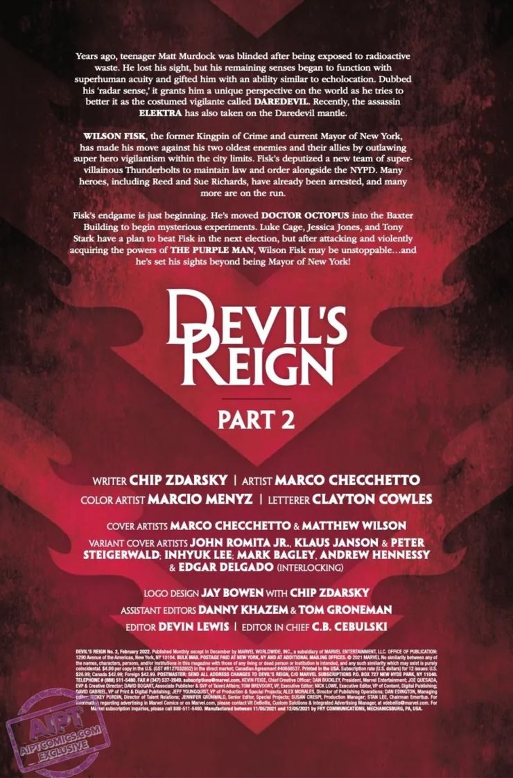 En el primer número de Reino del diablo del escritor Chip Zdarsy y el artista Marco Checchetto, héroes como Moon Knight ya han sido arrestados por los Thunderbolts recientemente sancionados de Kingpin, un grupo de agentes a gran escala que incluye una variedad de supervillanos suplentes como Doc Ock, Shocker, Taskmaster, Rhino y más que aceptaron trabajar para Fisk. Mientras que el Capitán América, Daredevil y el nuevo Spider-Man Ben Reilly pueden salvar a Miles Morales antes de que lo arresten, Reed y Sue Richards están equipados con collares amortiguadores de energía y enviados a prisión en el primer número del evento.