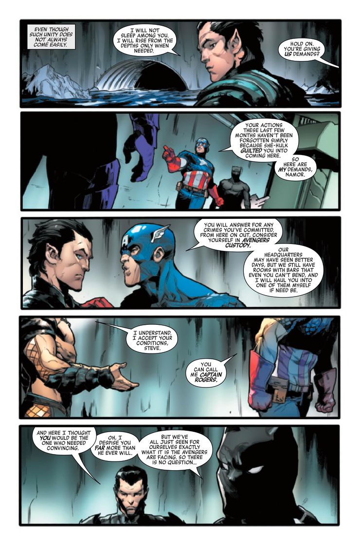 Namor se enfrentó recientemente con los Vengadores, cuando declaró que los mares estaban fuera del alcance de los humanos, enemistó al mundo de la superficie y puso a Atlantis bajo la ley marcial. Cuando los Vengadores lo confrontaron, él solo detuvo a gente como Thor, el Capitán Marvel, Ghost Rider, Iron Man y She-Hulk, y solo se detuvo cuando el Capitán América se lo pidió. Sin embargo, después de que She-Hulk salvó a Atlantis de la explosión de una bomba gamma, Namor prometió que haría cualquier cosa para pagarle, y Jen le pidió que se uniera a los Vengadores. Steve, sin embargo, está harto de la actitud arrogante de Namor y quiere que sea responsable de sus acciones. Él le dice que está oficialmente bajo la custodia de los Vengadores, y cuando Namor lo llama “Steve”, responde que es “Capitán Rogers” para él.