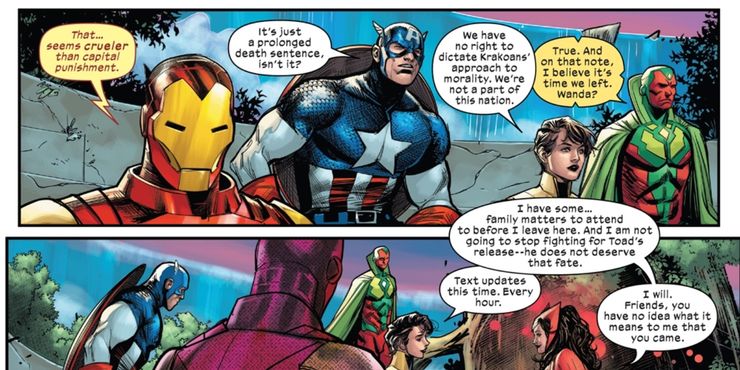 Cuando los Vengadores ven cómo los X-Men castigan a aquellos que encuentran culpables de crímenes, se horrorizan al darse cuenta de la crueldad detrás de sus acciones. Iron Man relaciona el castigo con la sentencia de muerte, mientras que el Capitán América dice que en realidad parecía un destino peor que la muerte, ya que es eternamente tortuoso. Los Vengadores se tragan rápidamente sus palabras, ya que no es su lugar para criticar la ley de Krakoan, pero sus pensamientos al respecto eran los suyos, y los Vengadores dejaron en claro que ya no consideran a los X-Men como héroes.