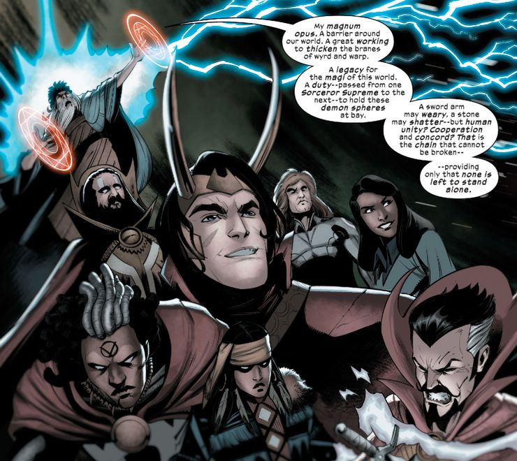 Nada menos que el propio Merlín abogó por un enfoque de equipo para preservar la barrera en todo el mundo, como se revela en Muerte del Doctor Extraño: X-Men/Caballero Negro #1 de Si Spurrier y Bob Quinn. Mientras que el némesis del Doctor Strange, el barón Mordo, cree que hay demasiados hechiceros y rituales arcanos, el sabio mago de la época artúrica habla con entusiasmo de la voluntad indomable de las personas que trabajan juntas. Cuando construye la barrera por primera vez, Merlín dice: “Un brazo de espada puede cansarse, una piedra puede romperse, pero ¿la unidad humana? ¿Cooperación y concordia? Esa es la cadena que no se puede romper, siempre que no quede nadie solo.”