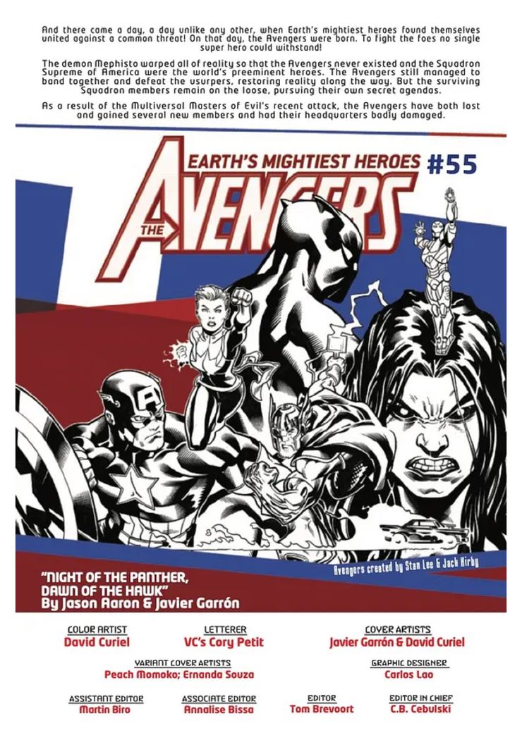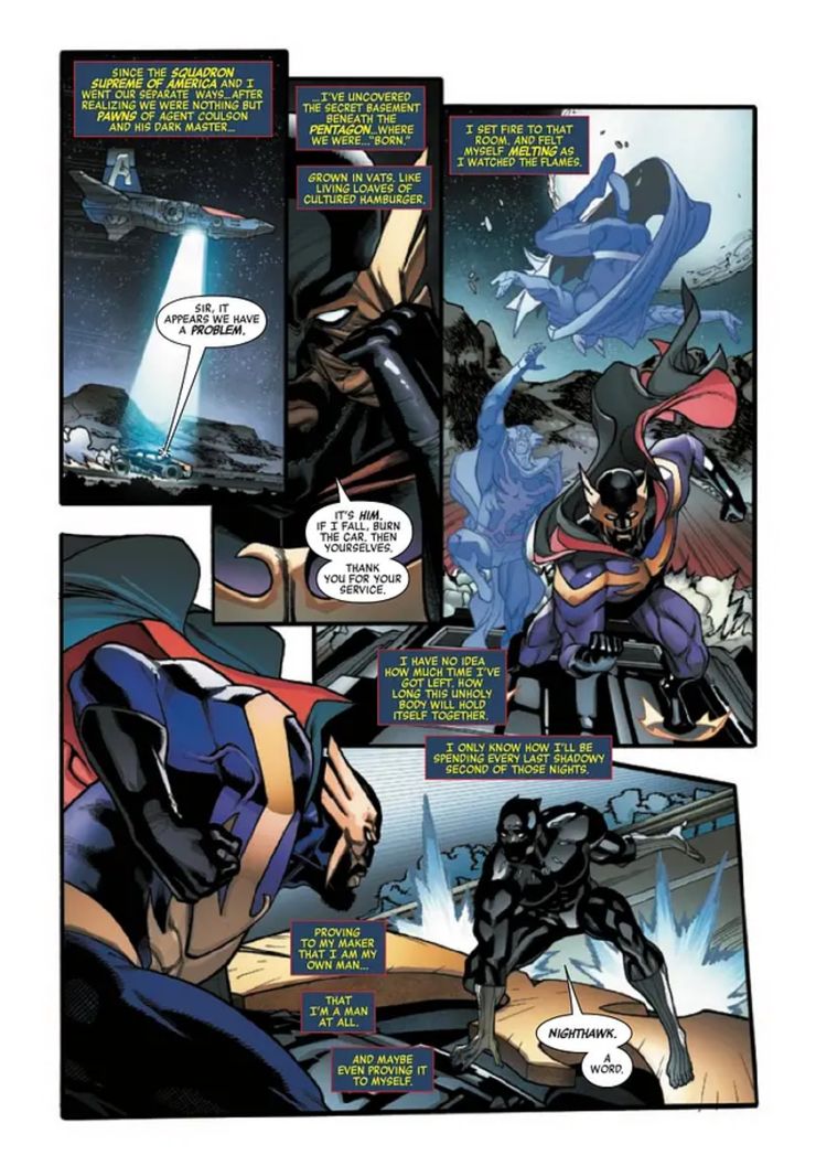 En una nueva vista previa de Avengers # 55 de Jason Aaron, Javier Garron, David Curiel y Cory Petit de VC de Marvel Comics, los lectores se encuentran con el Batman de Marvel, Nighthawk, que lucha por existir en el universo reiniciado. Nighthawk reflexiona sobre que su riqueza y su vida son una mentira inventada por Mephisto, ya que el Escuadrón Supremo se separó después de darse cuenta de que eran parte de la artimaña. Sin embargo, los intentos de venganza de Nighthawk se ven frustrados por Black Panther, que quiere saber por qué renunció como embajador de Estados Unidos en Wakanda.