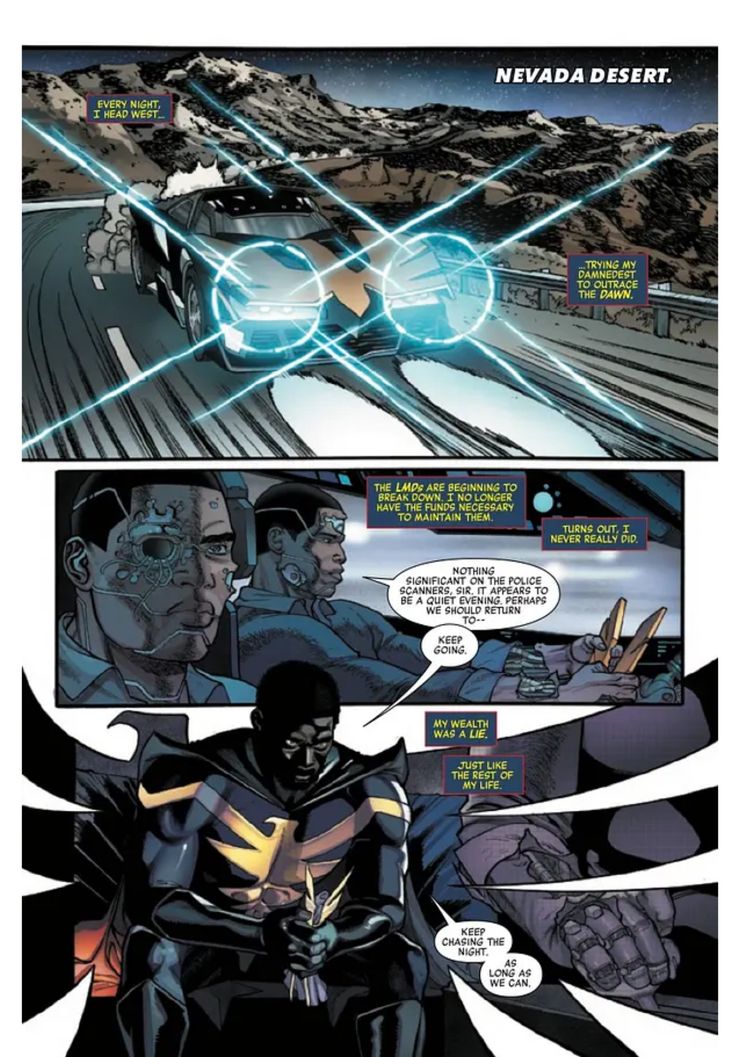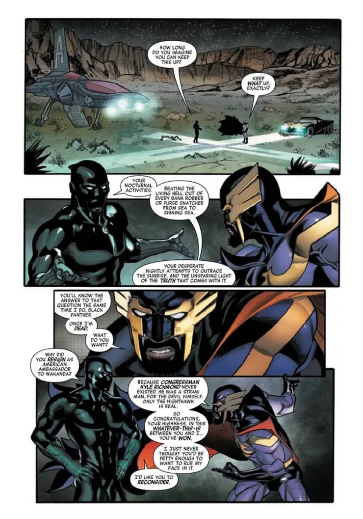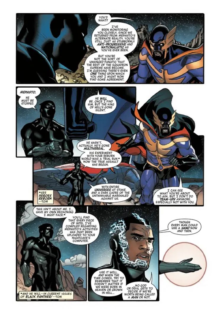 Black Panther no está listo para renunciar a Nighthawk, incluso si lo está. En cambio, le dice a Batman de Marvel que tienen un objetivo común al querer detener a Mephisto, revelando que el diablo de Marvel está tratando de conquistar el Multiverso. Si bien Nighthawk rechaza la oferta de formar equipo con los Vengadores, Black Panther aún le brinda toda la información que tiene sobre el paradero de Mephisto mientras le dice que está dispuesto a ofrecerle una mano amiga.