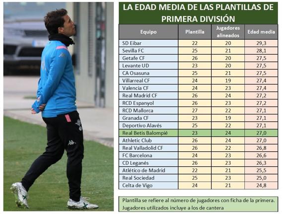 Betis posee la octava plantilla más joven de LaLiga, con una media de edad de 27 años -sin contar a los canteranos Ismael y Raúl, de 19 y 18 años, respectivamente, que bajarían la media casi a 26 años-, no así el Eibar, donde Mendilibar cuenta con la plantilla más veterana de toda la categoría, con una media de 29,3 años, según los datos de Transfermarkt.