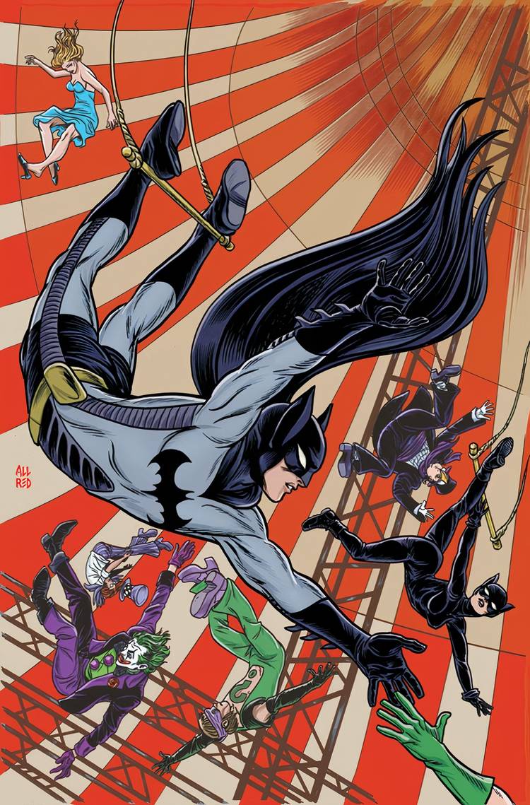 La portada principal para Batman: Edad Oscura #3 de Michael Allred muestra al Caped Crusader balanceándose desde un trapecio debajo de una gran carpa. Batman no está solo en el acto, ya que lo acompañan Catwoman, Joker, el Pingüino, Riddler y Mad Hatter.cada uno de ellos vestido con un disfraz extravagante y exagerado.