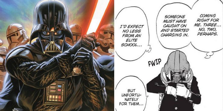 El amor de Kohei Horikoshi por los medios occidentales no es ningún secreto; Su afinidad por los superhéroes de Marvel y DC es lo que inspiró Mi héroe academia en primer lugar. Sin embargo, su otro tema favorito es Guerra de las Galaxias. Muchas ubicaciones en Mi héroe academiaEl Japón comparte nombres con planetas de la galaxia de Star Wars, como Takoba / Dagoba Beach, donde All Might entrenó por primera vez a Midoriya. Horikoshi logró deslizarse en una referencia más obvia con Mustard, miembro de la Liga de Villanos, quien apareció por primera vez en el ataque al Campo de Entrenamiento Forestal. La peculiaridad de Mustard crea gas mostaza, pero debe usar una máscara para protegerse de él. La máscara de gas de Mustard es estilísticamente muy similar a la de Darth Vader, y Mustard hace bastantes poses para enfatizar este hecho.