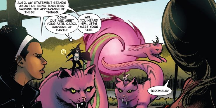 Sin embargo, antes de que el Capitán Marvel y Spectrum ayuden a Binary a comprender su lugar en el mundo, primero tuvieron que lidiar con algunos villanos ridículos que eran lo suficientemente molestos como para ser considerados una amenaza. Los villanos en cuestión son conocidos como Snats o Snatmen y habían venido de otro universo para asegurarse de que la muerte del Capitán Marvel se lleve a cabo de su mano. Esto suena realmente intimidante, hasta que lo absurdo de estos villanos golpea a los lectores en la cara. Los Snats son brujos sin camisa (como si usaran sombreros de brujas puntiagudos y empuñaran varitas con estrellas en el extremo) que montan a lomos de gatos-dragón gigantes que dejan un rastro de hedor dondequiera que vuelan. Básicamente, estos tipos son tan extraños que la propia Carol no puede creer que tenga que luchar contra ellos, y es poco probable que el público de MCU pueda comprarlo a menos que toda la escena se reproduzca como una broma completa, pero incluso entonces, la acción en vivo Snats todavía sería un poco demasiado ridículo.