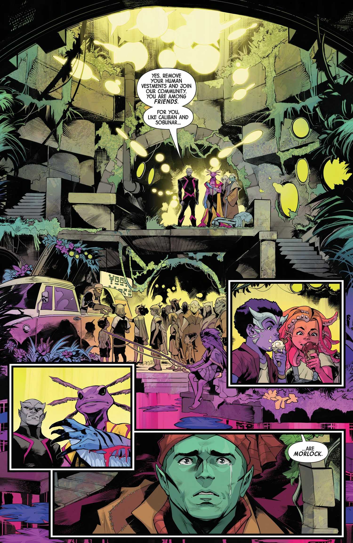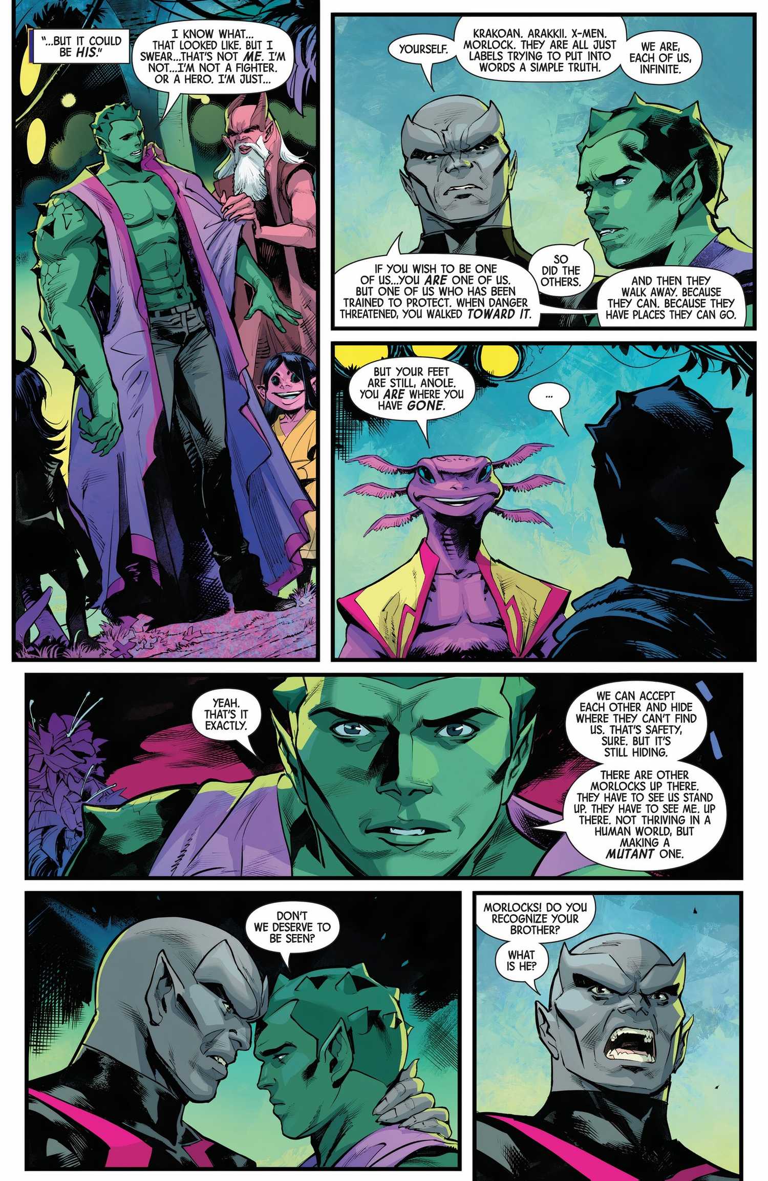 En nix #3el ex X-Men Anole sigue a Caliban bajo tierra para descubrir el escondite de los Morlocks. Lo reciben con los brazos abiertos, declarando que es uno de ellos. Al igual que los Morlocks, la apariencia claramente “mutante” de Anole hace que sea imposible mezclarse con la sociedad humana a la que los obligó la caída de Krakoa.