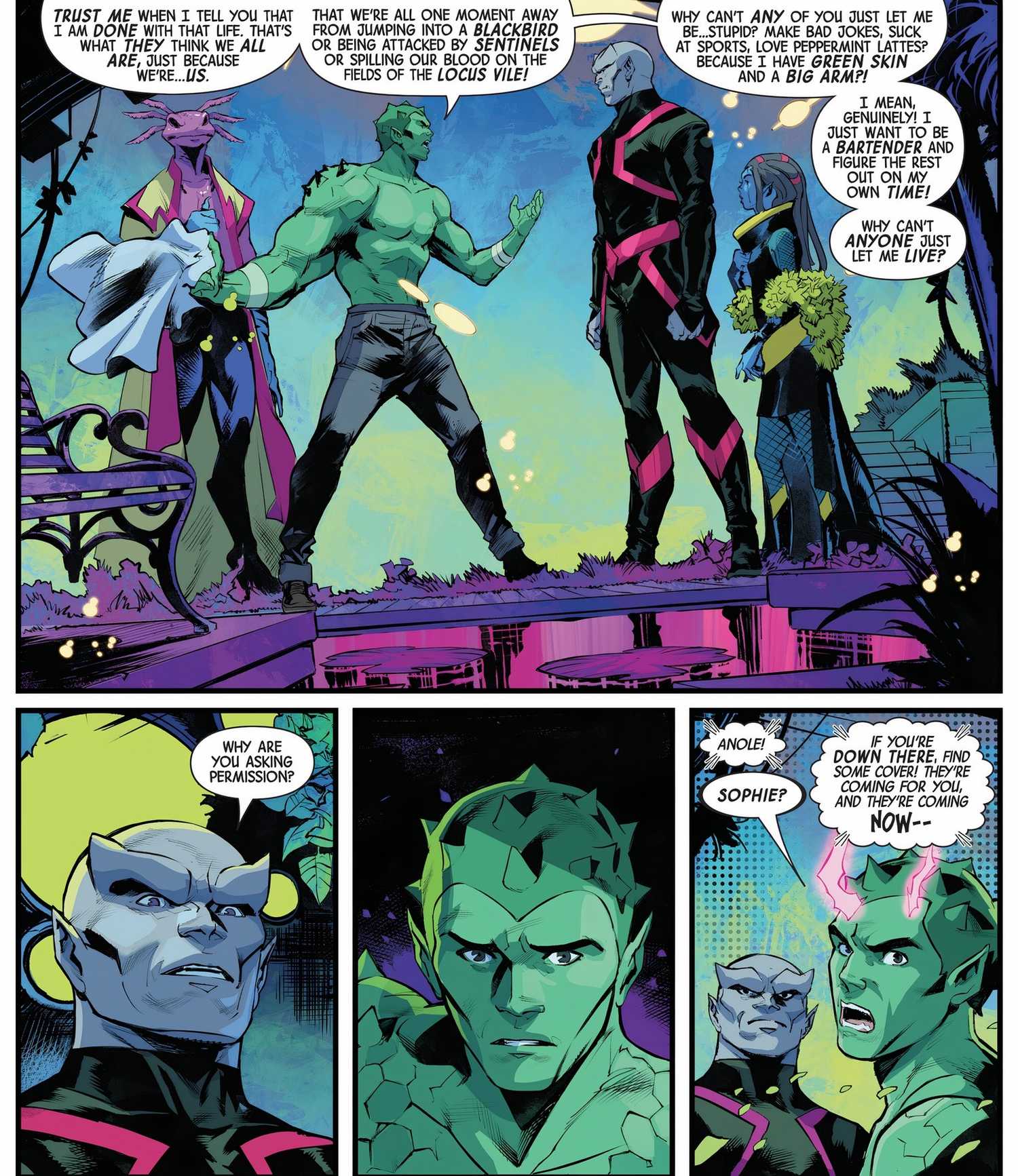 Anole no es el único mutante que expresa frustración por la constante expectativa de pelear. Incluso los X-Men veteranos como Kitty Pryde se han distanciado del equipo, ya que luchan por encontrar una razón para continuar como lo hacían antes. Los líderes de Mutankind, especialmente Cyclops y Rogue, no pueden ponerse de acuerdo sobre el camino correcto a seguir. En resumen, los mutantes que buscan orientación luchan por encontrarla, mientras lamentan la pérdida de sus vidas y la cultura que crearon en Krakoa. Los X-Men alguna vez fueron el centro de la vida mutante, pero ese ya no es el caso.
