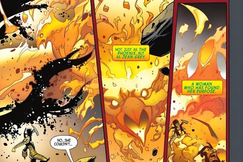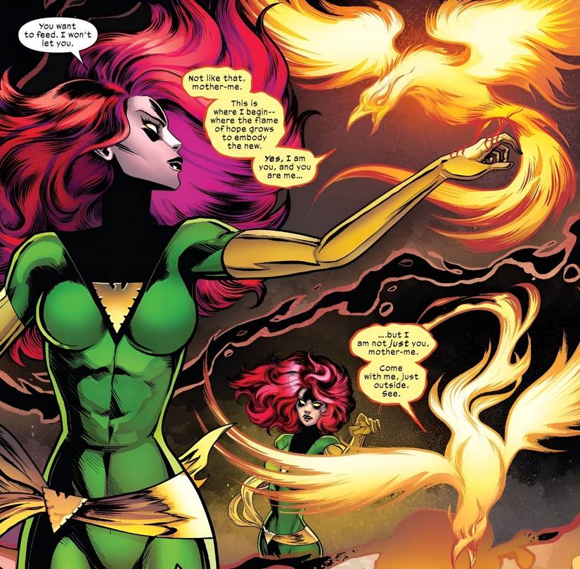 Aquí, el Phoenix relata el trauma y las pruebas de su vida antes de declarar que ella, no solo la fuerza de Phoenix, ha encontrado un propósito en ese dolor. Después de todo lo que ha experimentado con los X-Men, Jean Gray finalmente ha superado su necesidad de que el equipo se convierta en algo más.