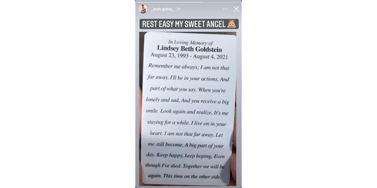 A su vez, Josh también compartió otro mensaje sobre su hermana a través de Instagram Story (captura de pantalla a continuación). Esta vez, el mensaje provino de una tarjeta impresa que incluía su nombre completo, Lindsey Beth Goldstein, junto con su fecha de nacimiento (23 de agosto de 1993) y fecha de muerte (4 de agosto de 2021). La tarjeta también tenía un poema de Deborah J. Birdoes que dice: “Recuérdame siempre; no estoy tan lejos. Estaré en tus acciones, y seré parte de lo que digas. Cuando estés solo y triste, y recibas una gran sonrisa. Míralo de nuevo y date cuenta, soy yo. por un tiempo. Amo en tu corazón. No estoy tan lejos. Déjame convertirme en, Una gran parte de tu día. Mantente feliz, sigue esperando, Aunque haya muerto. Juntos volveremos a ser. Esto el tiempo en el otro lado “.