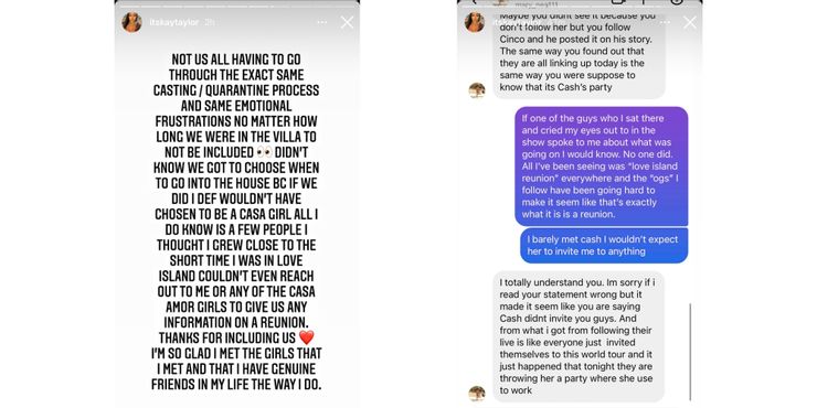 Kay Taylor luego compartió un intercambio privado de mensajes directos entre ella y un Isla del amor ventilador. Este fan parecía estar defendiendo a Cashay Proudfoot ante Kay, pero Kay dijo que apenas conocía a Cash y, por lo tanto, no esperaba recibir una invitación de ella. A su vez, Kay esperaba que los chicos con los que pasó tiempo en el programa se acercaran a ella y a las otras chicas de Casa Amor. Sin embargo, este viaje a Nueva York ha sido etiquetado como un Love Island Estados Unidos reunión sin incluir a todo el elenco.