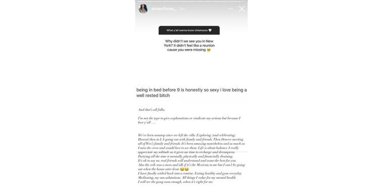 Por desgracia, Aimee decidió no asistir a la reunión informal del elenco que tuvo lugar el pasado fin de semana en la ciudad de Nueva York. Como se ve en la captura de pantalla a continuación, Aimee compartió su larga razón a través de Instagram Story. Aimee explicó que ha estado demasiado ocupada conociendo a Wes fuera de la villa, así como a sus amigos y familiares. Mientras que algunos isleños se quejaban de que no los invitaban a este Isla del amor reunión, Aimee sintió que este no era el momento para que ella se reuniera con sus coprotagonistas de la temporada 3. De hecho, aprecia el hecho de que finalmente volvió a la rutina diaria de su vida. Por lo tanto, no quería romper esa rutina recién establecida en este momento.