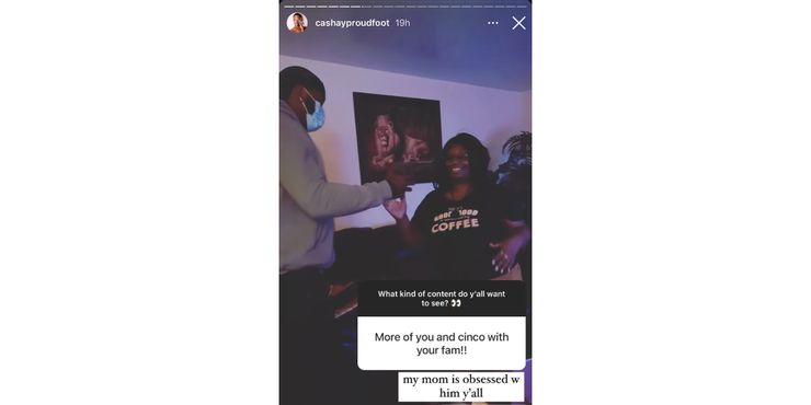 Los fanáticos sabían que Cashay ya había conocido a la familia de Cinco meses atrás. De hecho, Cash incluso pasó las vacaciones de 2021 con Cinco y su familia. Ahora, sin embargo, aparentemente Cinco también conoció a la familia de Cash y fue muy bien recibido por ellos. Como se ve en la captura de pantalla a continuación, Cashay comenzó una nueva sesión de preguntas y respuestas de Instagram en la que preguntó a los seguidores qué tipo de contenido les gustaría ver de ella. Un fan pidió ver más de Cinco saliendo con la familia de Cashay. En respuesta, Cash compartió un video de Cinco saludando a la madre de Cash y escribió: “Mi mamá está obsesionada con él”. Los fanáticos ya sabían que Cinco había conocido a la familia de Cash en algún momento, pero un video conmovedor como este es emocionante para que todos lo vean.