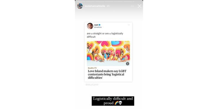 Ahora, Leslie está arrojando sombra a la Isla del amor productores que continuamente presentan razones por las que no pueden incluir isleños LGBTQIA + en el programa. Específicamente, Leslie recurrió a Instagram Stories para reaccionar a un El sol artículo de junio de 2021. En la historia, la comisionada de ITV, Amanda Stavri, afirmó que los concursantes LGBTQIA + presentarían un “especie de dificultad logística” si fueran elegidos en la serie. Como se ve en la captura de pantalla a continuación, Leslie reaccionó recientemente a esa historia llamándose a sí misma “lógicamente difícil y orgulloso”. Cabe señalar que esta declaración provino de los productores del original británico Isla del amor serie, no de productores detrás Love Island Estados Unidos en CBS.
