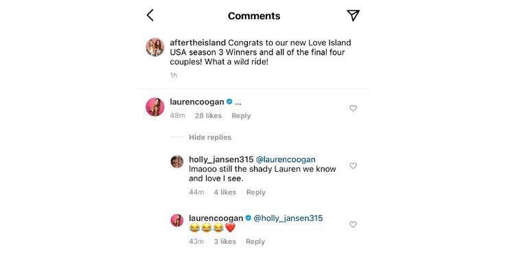 Parece cierto ex Love Island Estados Unidos a las estrellas no les gustó el hecho de que Olivia y Korey ganaran el programa. Después de que se anunció su victoria, los Después de la isla El podcast copresentado por Alexandra Stewart y Elizabeth Weber compartió una publicación de Instagram felicitando a la pareja. Sin embargo, Lauren Coogan dejó un mensaje turbio en la sección de comentarios (captura de pantalla a continuación). Cuando un fan señaló que Lauren estaba siendo sospechosa con los campeones de la temporada 3, ella respondió con algunos emojis de risa y un emoji de corazón. La publicación original de Instagram se puede encontrar aquí. Al momento de escribir este artículo, el comentario de Lauren todavía se muestra debajo de la publicación.