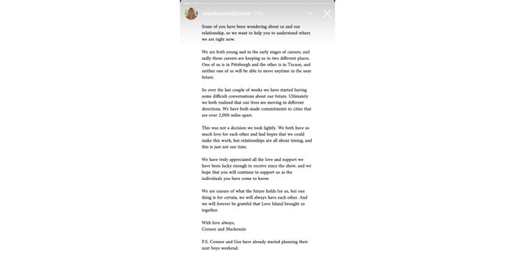 Desafortunadamente, el post-post de Mackenzie y ConnorIsla del amor, estados unidos de américa La relación ahora ha llegado a su fin, y ella compartió una larga declaración a través de Instagram Story explicando las razones. Mackenzie comenzó recordando a los fanáticos que ella y Conor recién están comenzando nuevas carreras. En su búsqueda de crecimiento profesional, Mackenzie se ha comprometido a vivir en Tucson, Arizona, mientras que Connor acaba de aceptar un trabajo de tiempo completo en Pittsburgh, Pensilvania. Ella añadió, “Así que durante las últimas semanas, hemos comenzado a tener algunas conversaciones difíciles sobre nuestro futuro. Al final, ambos nos dimos cuenta de que nuestras vidas se están moviendo en diferentes direcciones”. Mackenzie explicó que esta ha sido una decisión difícil, luego les pidió a los fanáticos que siguieran apoyándolos como individuos.