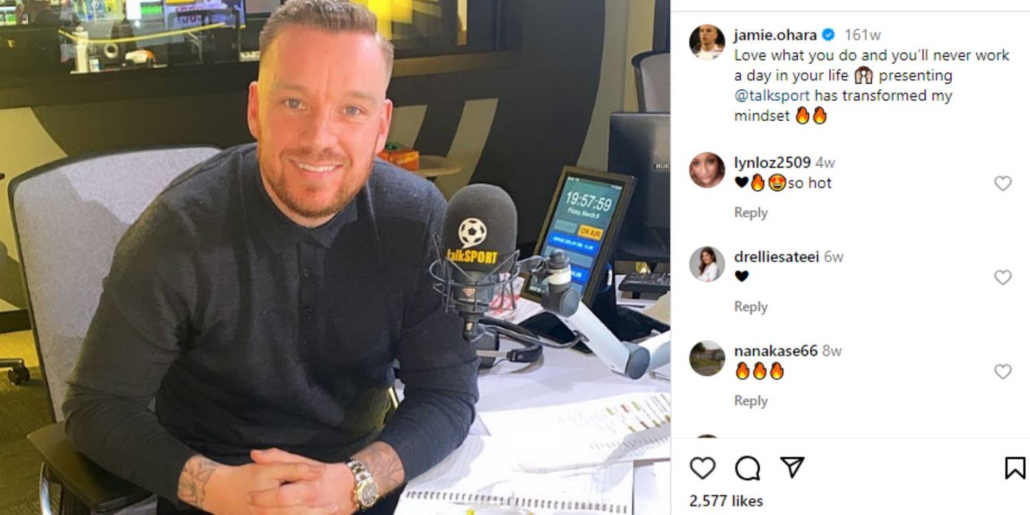 Jamie O’Hara se inició en la Premier League jugando en el Tottenham Hotspur, donde jugó durante seis años. El excentrocampista de 36 años pasó los últimos años de su carrera jugando en el Billericay Town. Se jubiló en 2020 y actualmente se desempeña como analista. Jamie estuvo casado con la ex Miss Inglaterra Danielle Lloyd de 2012 a 2014 y comparten tres hijos. jamie cuenta con más de 153.000 seguidores en Instagram. En marzo de 2021, jamie publicó una foto de él mismo sentado frente a un micrófono, con la leyenda: “Ama lo que haces y no trabajarás ni un día de tu vida.”