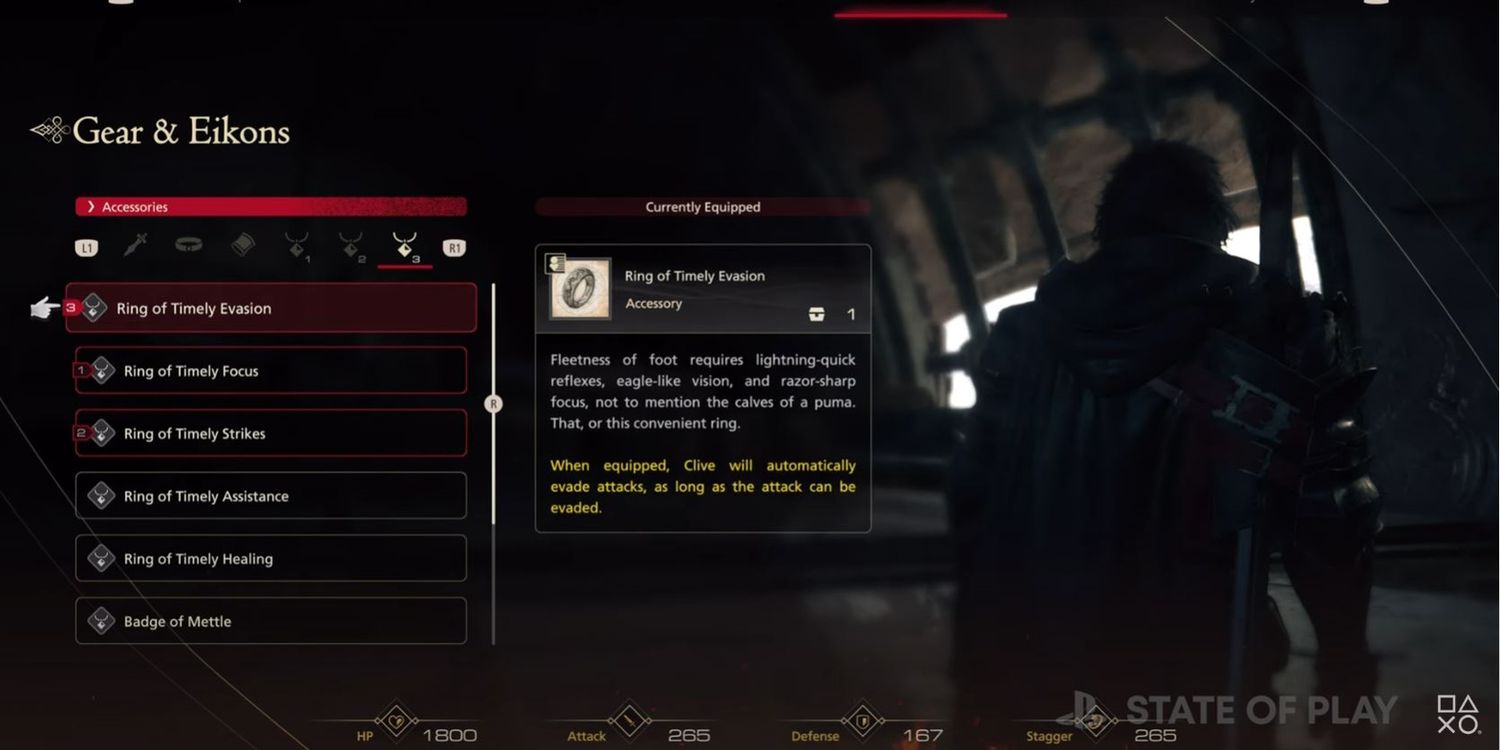 En lugar de que haya ajustes de dificultad preprogramados para FF16, los jugadores tendrán control sobre qué cosas específicas pueden resultar demasiado difíciles y las formas de sortear cada una de ellas. Por lo tanto, hay accesorios únicos en el juego llamados Timely Rings for Clive para equipar que brindan a los jugadores los medios para facilitar cosas como esquivar. Solo se pueden equipar dos de estos anillos a la vez, pero se pueden intercambiar hasta que los jugadores encuentren la combinación adecuada de características que se ajusten a su estilo de juego.