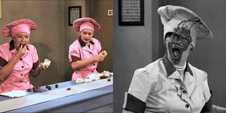 En un momento dado, Lucy y Ethel deben envolver cada caramelo que pasa en una cinta transportadora. Inicialmente, el caramelo entra lentamente, pero la velocidad de la cinta transportadora aumenta. Finalmente, Lucy y Ethel se encuentran en medio del caos, luchando por envolver los dulces, ya que llegan cada vez más rápido. La hilarante escena se considera uno de los momentos más icónicos de la historia de la televisión.