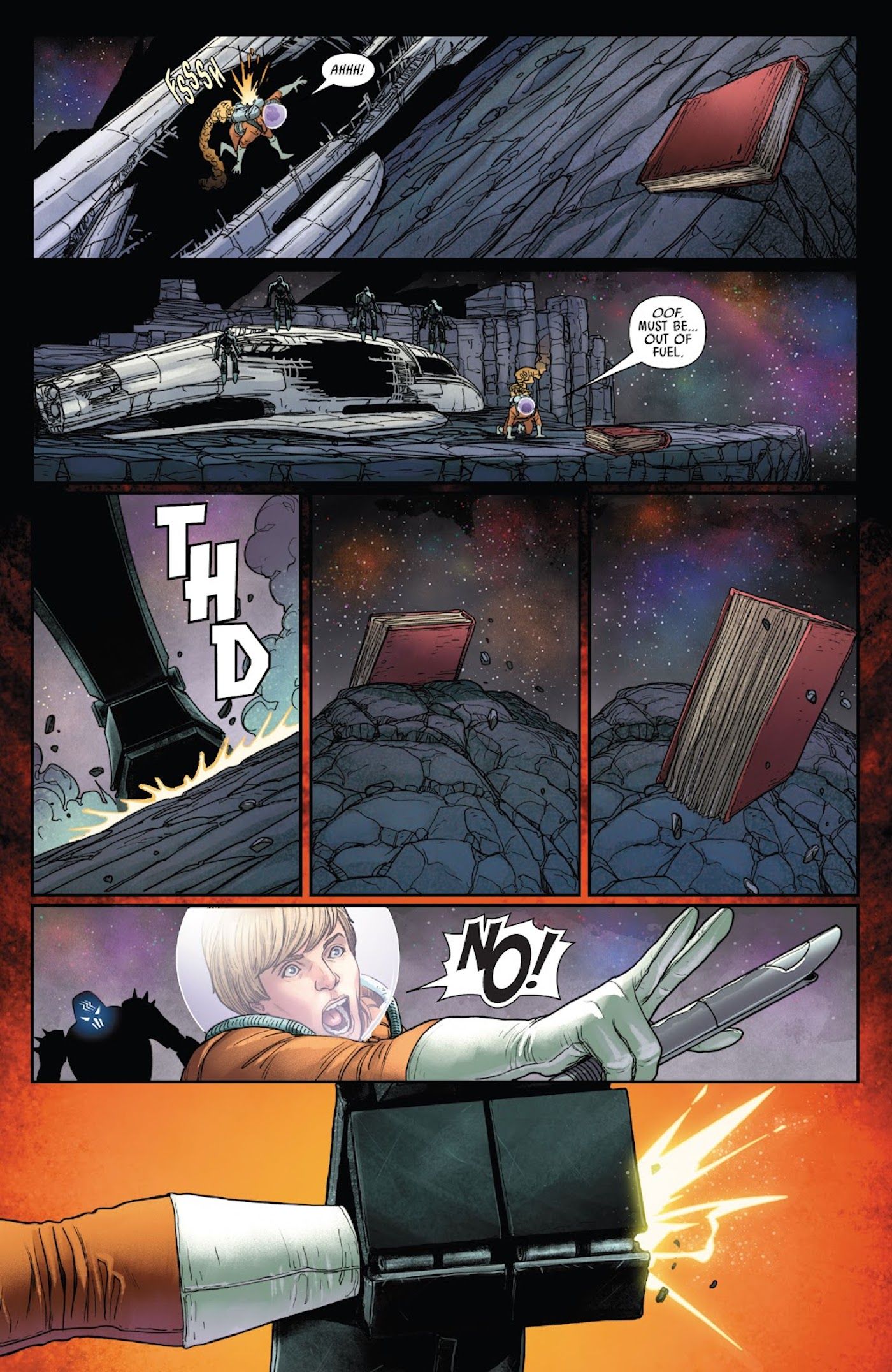 Guerra de las Galaxias #32 por Charles Soule y Madibek Musabekov retoma a Luke y sus amigos varados en No-Space con su nave rodeada de Killdroids. Mientras el resto del equipo tiene como objetivo recuperar un Path Engine que puede significar su salida del No-Space, Luke tiene una misión propia: recuperar un texto Jedi. Mientras los demás intentan entrar y salir rápidamente, Luke arriesga su vida para volver a buscar el libro sagrado que dejó atrás.